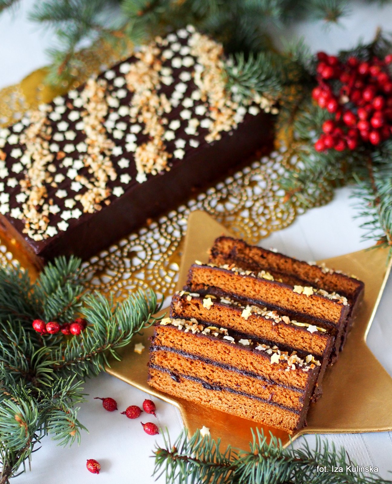 Uwaga! Mnie z tej blaszki (39×26 cm) wyszły trzy kawałki wielkości małej keksówki. W zeszłym roku pokroiłam na mniejsze kwadraty i bardzo pięknie prezentowały się oblane czekoladą oraz przyozdobione świąteczną posypką cukrową. Osobiście bardzo lubię pokrywać go złotą mgiełką. Smaczny pomysł na świąteczny upominek! 🙂